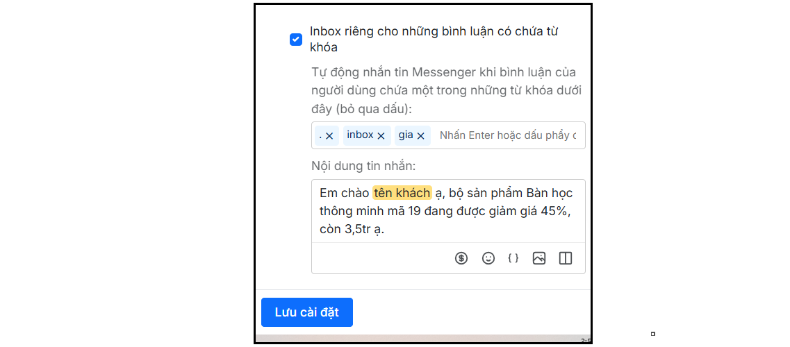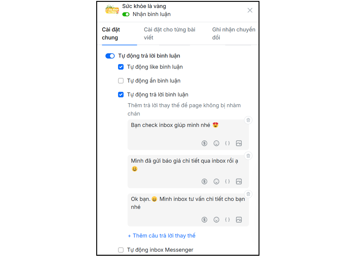 - Tự động inbox Messenger: Tin nhắn tự động inbox Messenger khi khách hàng để lại bình luận trên bài viết.