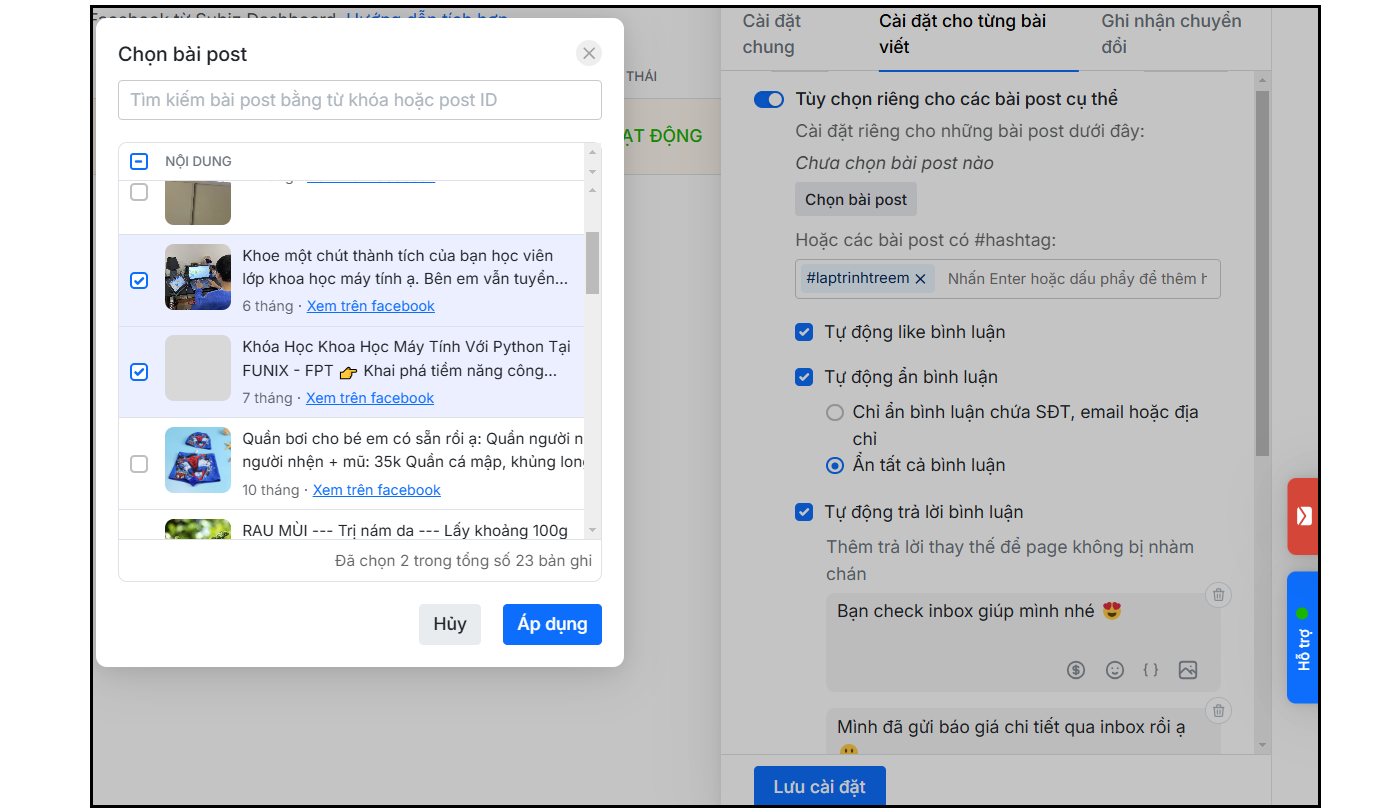 Cài đặt cụ thể cho bài viết: Sau khi chọn bài viết hoặc hashtag, tiến hành thiết lập các tính năng như: tự động like bình luận, ẩn bình luận, gửi inbox Messenger,...
