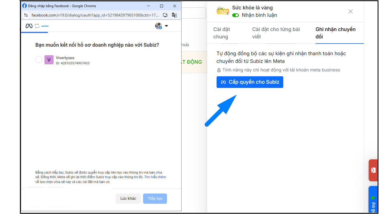 Vào Cài đặt Fanpage => Ghi nhận chuyển đổi => Cấp quyền cho Subiz