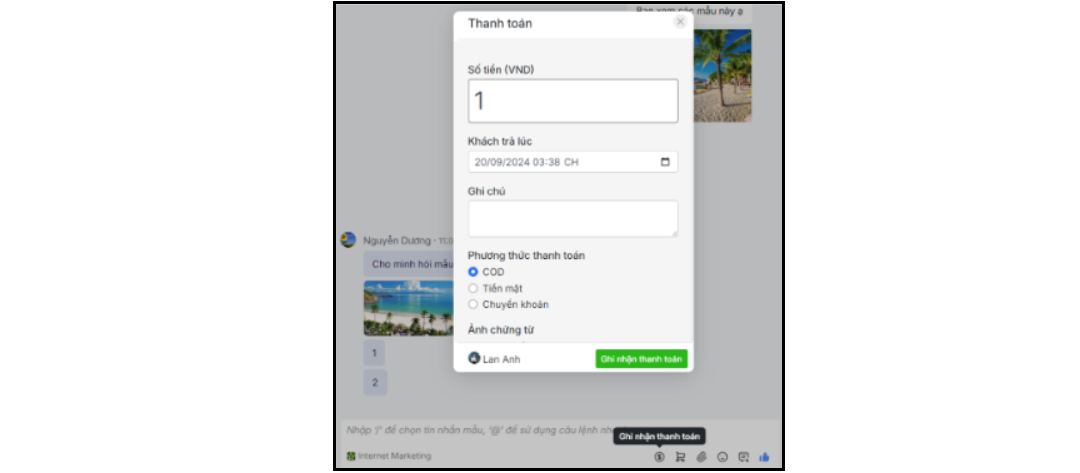 Khi khách nhắn tin đến từ quảng cáo Facebook và đạt mục tiêu chuyển đổi, bạn bấm nút Ghi nhận thanh toán để nhập thông tin vào bảng.