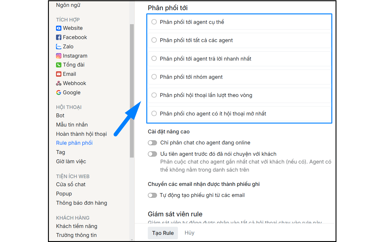 Phân phối tới: Bạn có thể tạo Rule giao khách hàng cho một hay nhiều nhân viên trả lời khách bằng các cách thực như: