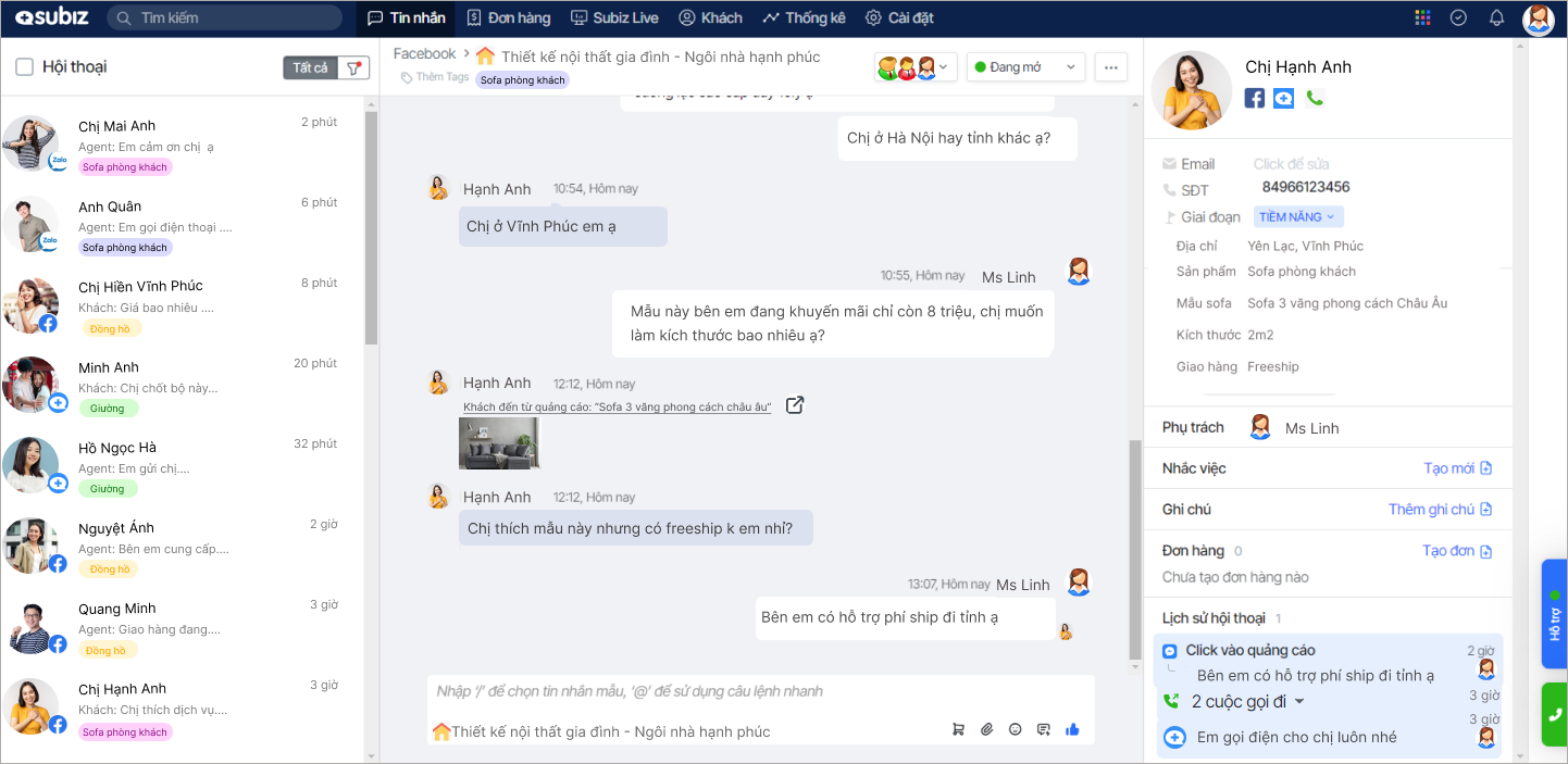 - Cột trái - Danh sách hội thoại: Hiển thị kênh tin nhắn (bình luận, hoặc Messenger), tên khách hàng, người nhắn cuối cùng,...