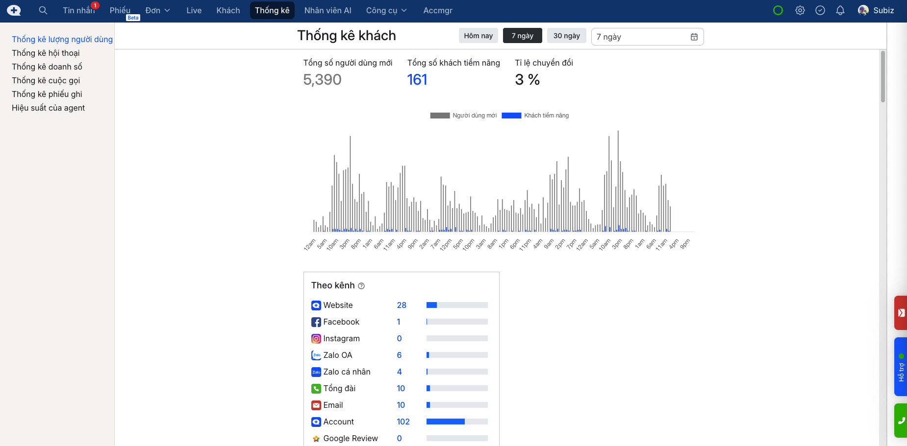Hệ thống Thống kê của Subiz mang đến bức tranh toàn diện về hiệu suất đội ngũ và xu hướng tương tác trên đa kênh.