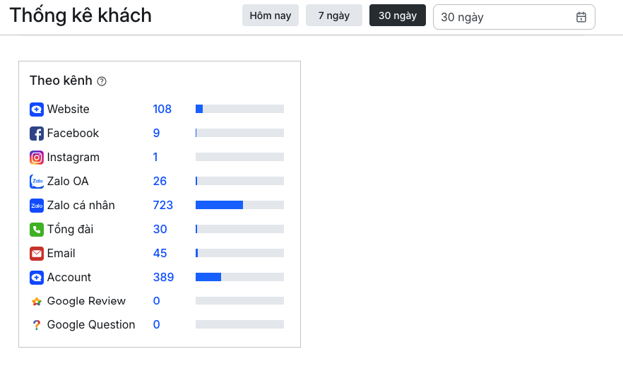 Bạn đang có nhiều kênh chăm sóc khách hàng như: Website, Fanpage, Zalo cá nhân, Zalo OA. Vậy kênh nào mang lại nhiều người dùng cho Doanh nghiệp, bạn xem tại mục Kênh tương tác.