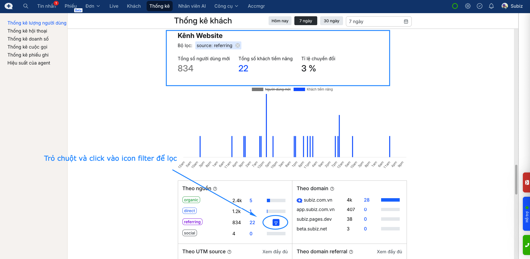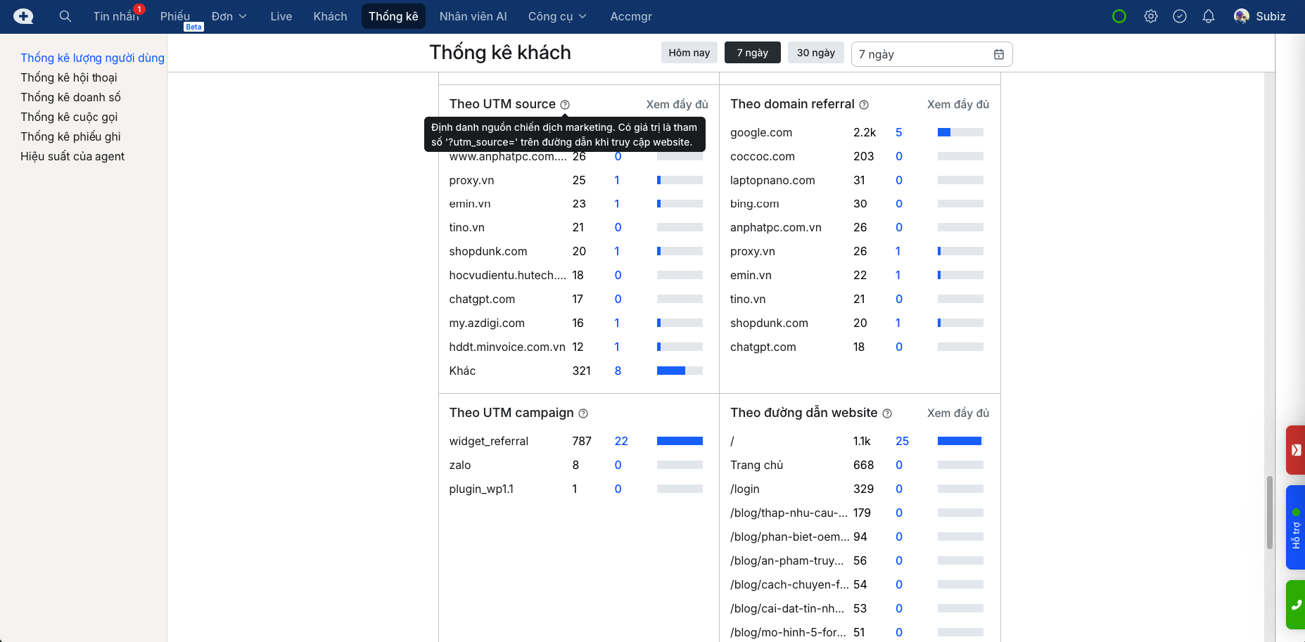 Với kênh website, Subiz không chỉ hỗ trợ thống kê lượng truy cập, tracking theo thời gian thực mà còn hỗ trợ theo dõi nguồn khách về chi tiết.
