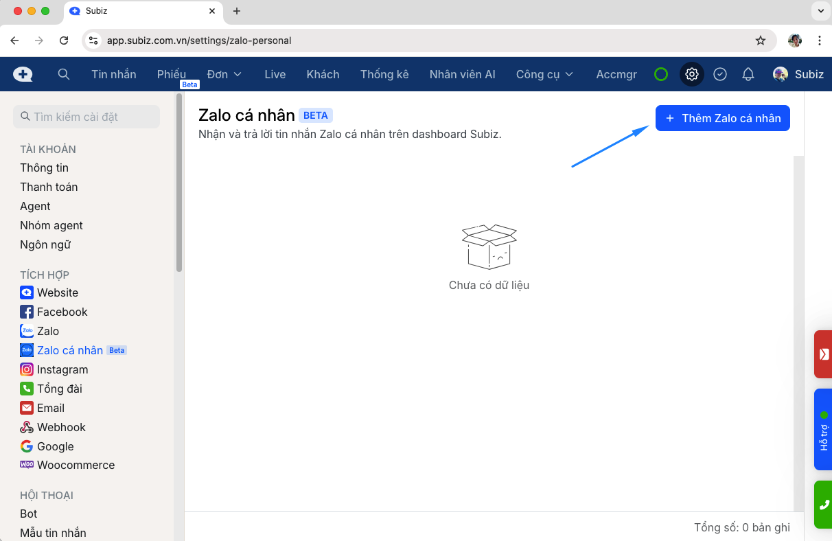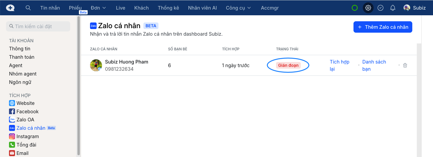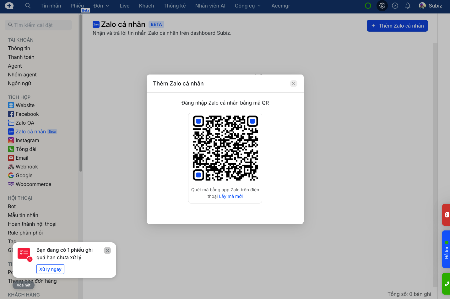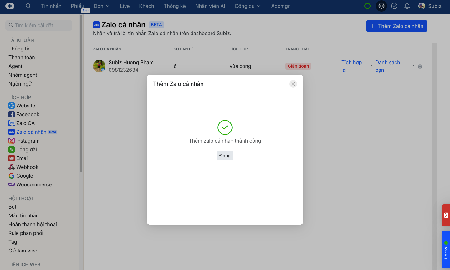 Tích hợp & Quản lý Zalo cá nhân trên Subiz