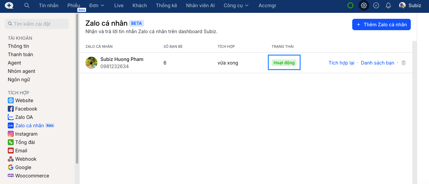 Subiz hỗ trợ tích hợp lên tới 100 tài khoản Zalo cá nhân, bạn tích hợp lần lượt theo các bước ở trên, đợi chuyển trạng thái Hoạt động là xong.