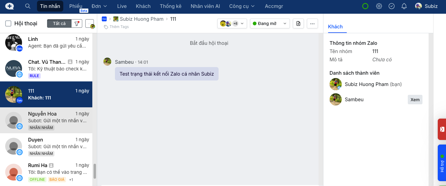 Khi kết nối thành công, các hội thoại sẽ lần lượt xuất hiện trên Subiz khi bạn nhận/gửi tin nhắn. Ví dụ test gửi tin nhắn từ Zalo trên điện thoại vào nhóm có tên “111” , màn hình dashboard Subiz sẽ: