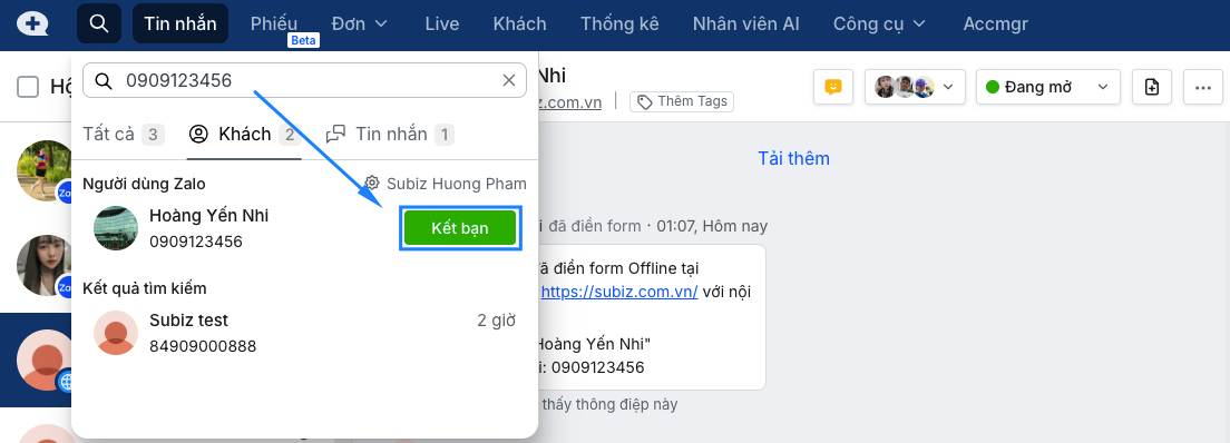Ưu điểm lớn nhất c ủa Zalo cá nhân là khả năng chủ động kết nối. Bạn có thể thực hiện ngay trên giao diện phần mềm Subiz.