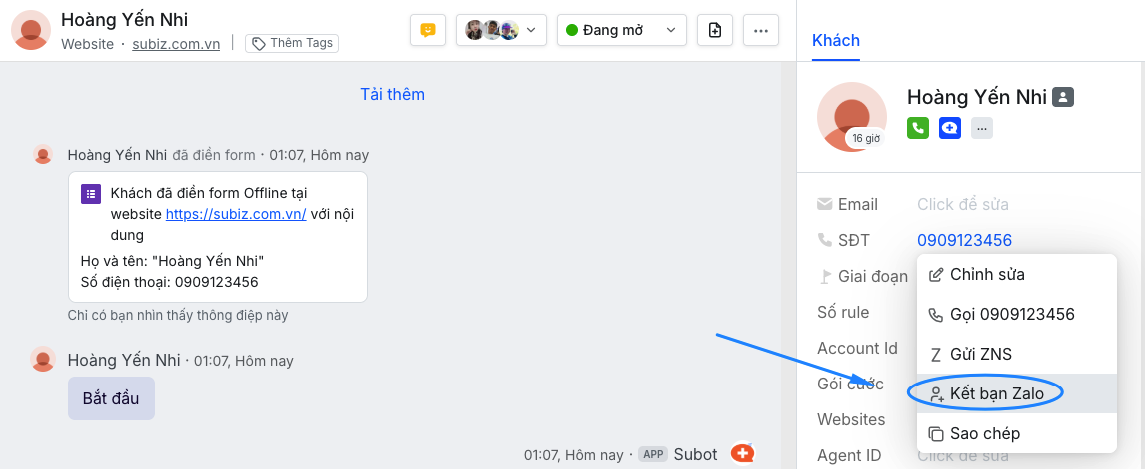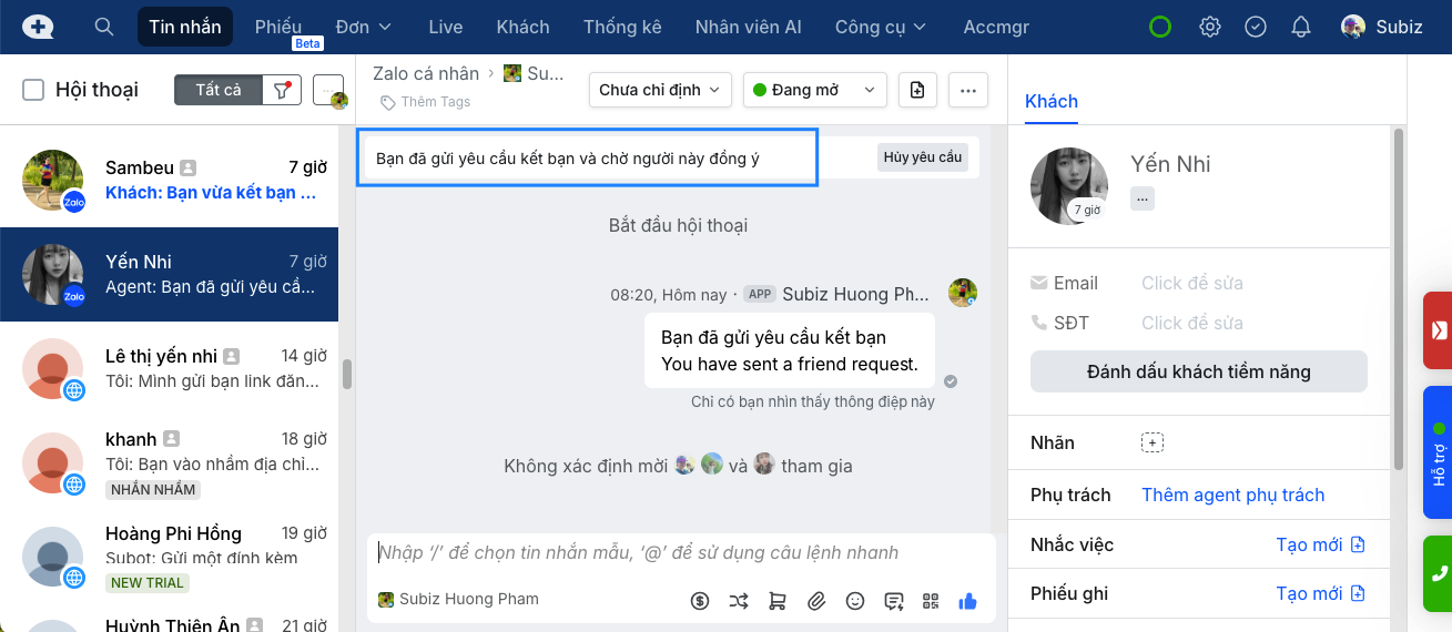 Agent chủ động kết bạn Zalo với khách trên Subiz