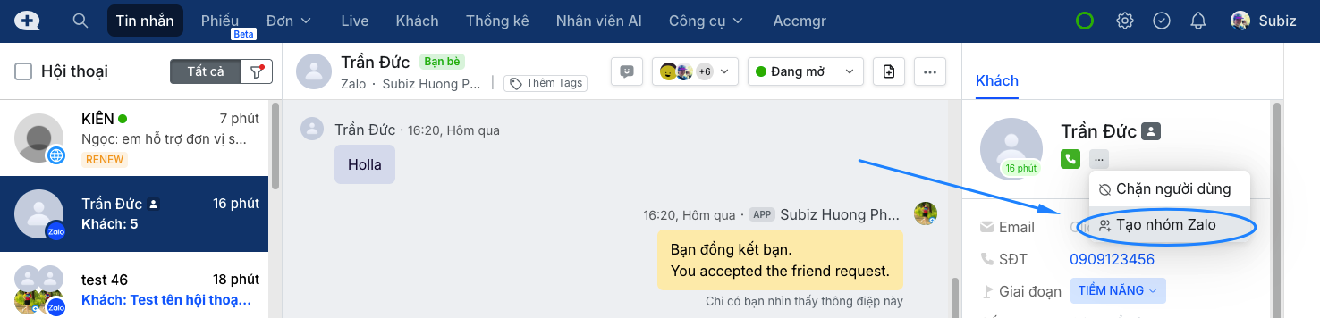 - Tìm tới hội thoại với khách hàng cần tạo nhóm