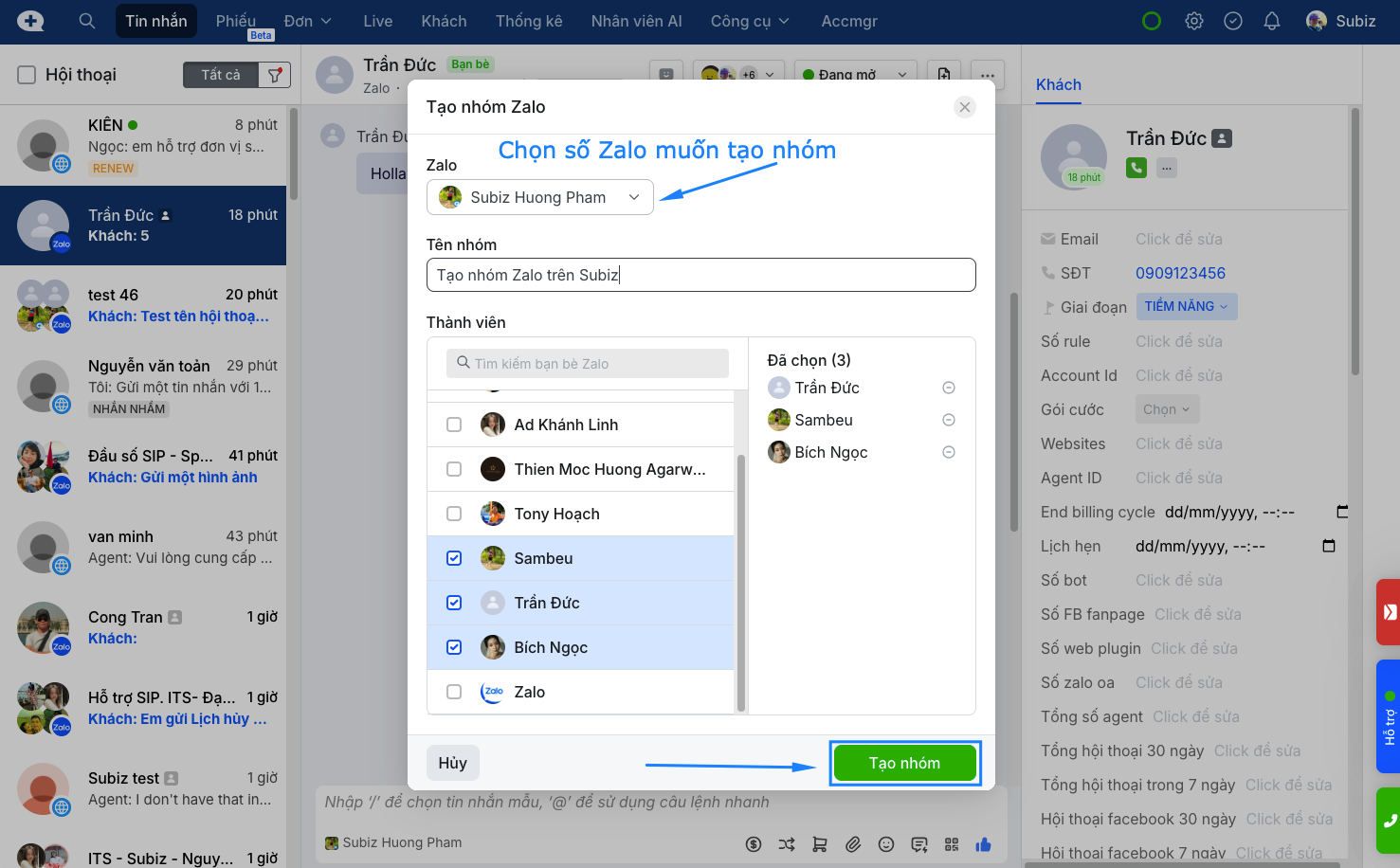 - Gõ vào thanh công cụ tên/số điện thoại khách hàng muốn add vào nhóm