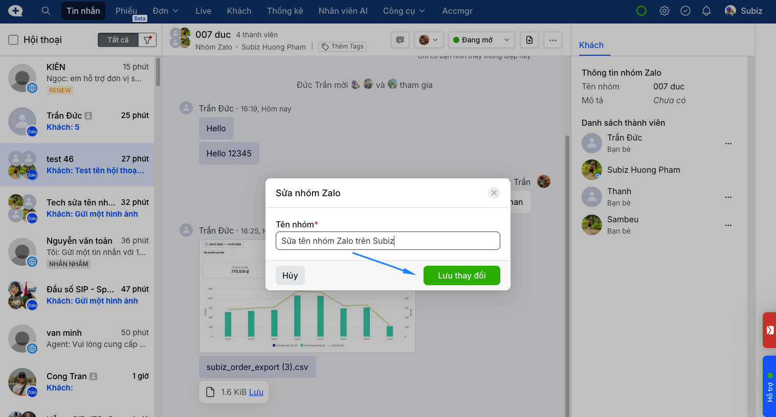 Chỉnh sửa tên nhóm Zalo trên Subiz