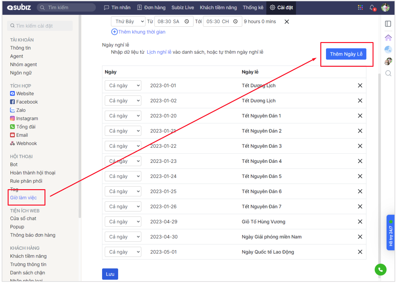 Bạn thêm ngày nghỉ Lễ tại trang Giờ làm việc. Như vậy, Subiz tự động nhận diện Ngày lễ là ngày không làm việc để bạn cài đặt điều kiện cho các chức năng khác chạy khi ngoài giờ làm việc như cửa sổ chat, bot, popup. Xem hướng dẫn sử dụng Giờ làm việc.