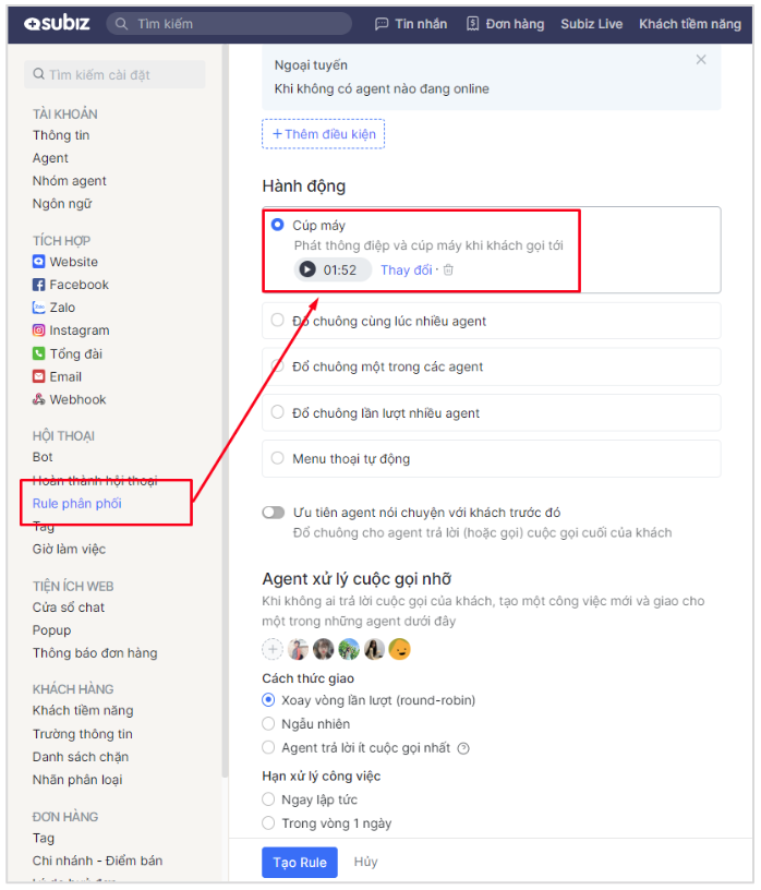 Bạn có thể tạo lời thoại chờ theo nhu cầu bằng công nghệ AI chuyển âm thanh từ văn bản hoặc trực tiếp tải file lời thoại trả lời cuộc gọi lên Subiz.
