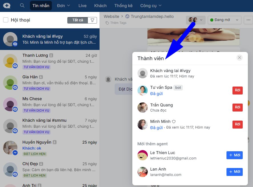 - Xem trạng thái agent là chưa đọc hoặc đã xem hội thoại, thêm hoặc loại bỏ agent khỏi hội thoại.