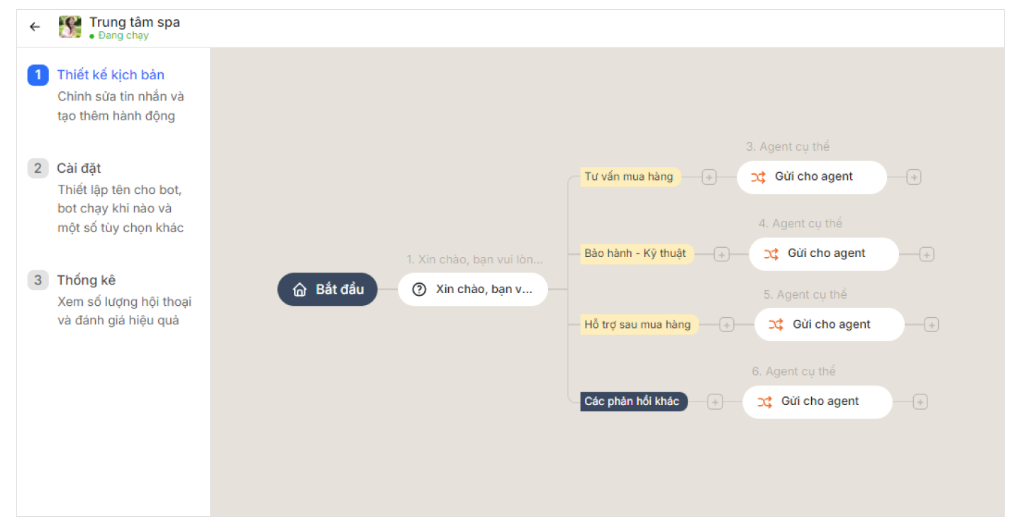 - Bot hỏi khách cần tư vấn bảo hành, kỹ thuật hay mua hàng; sau đó giao khách đến agent bộ phận phụ trách.