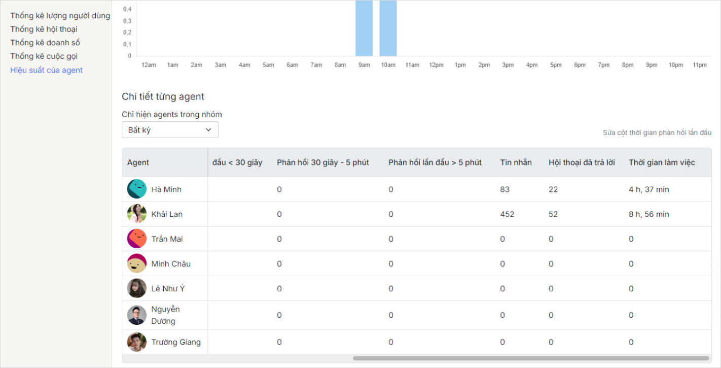 Subiz cung cấp thống kê chi tiết hiệu suất của từng agent bao gồm: