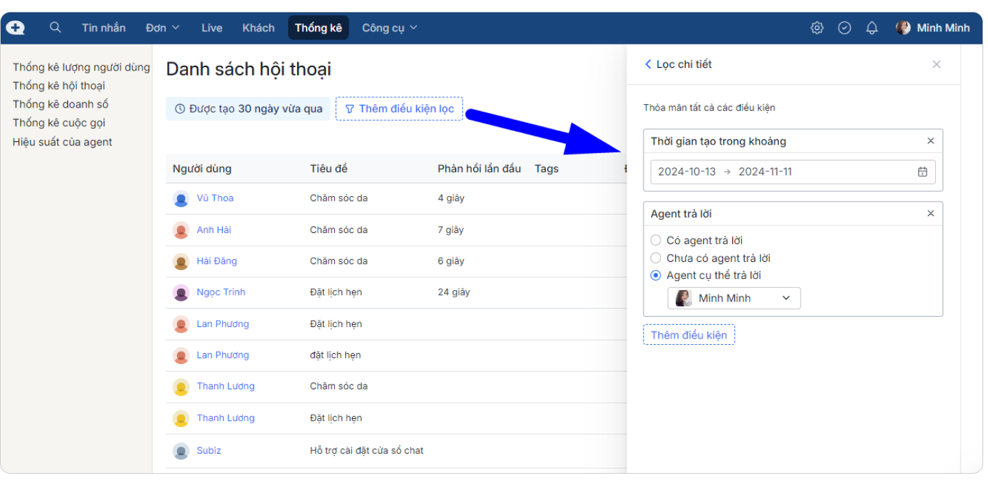 Bạn có thể lọc tìm các hội thoại cụ thể của một agent tại trang Danh sách hội thoại bằng cách lọc điều kiện “Agent trả lời”
