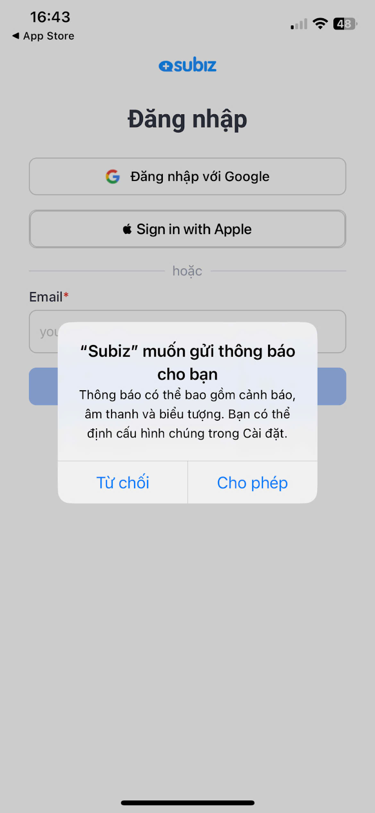 Ngay khi cài đặt ứng dụng Subiz trên điện thoại, vui lòng chọn Cho phép khi được hỏi Subiz muốn gửi thông báo cho bạn.