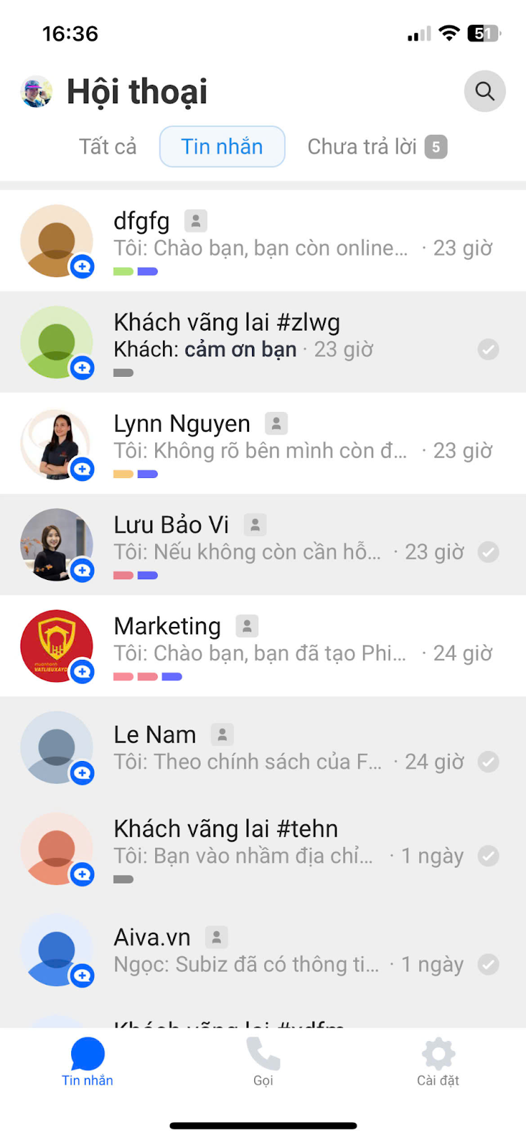 Phản hồi tin nhắn - gọi điện tổng đài trên app mobile Subiz