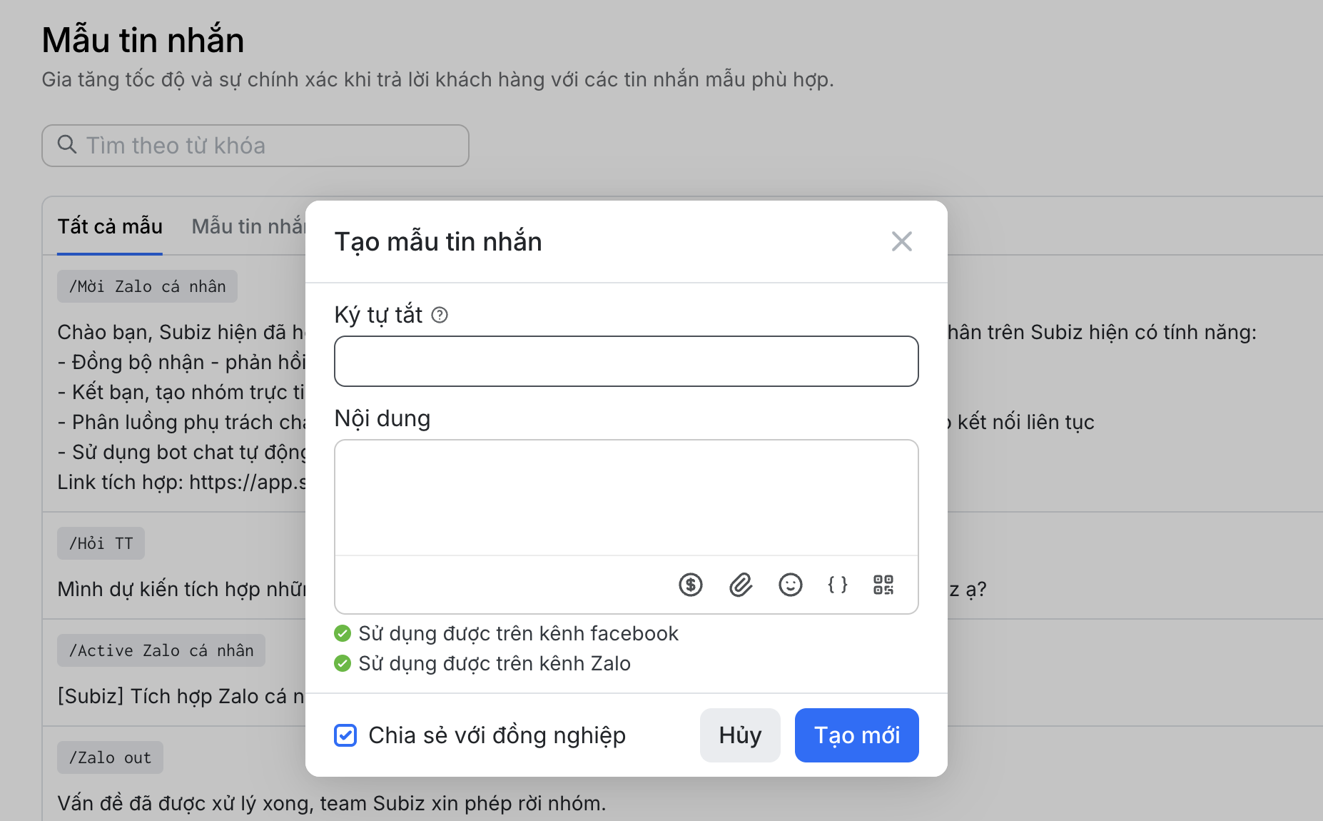 - Cách 2: Tại ô nhập tin nhắn, nhấp nút “Mẫu tin nhắn” > Tìm kiếm ký tự tắt hay từ khóa liên quan