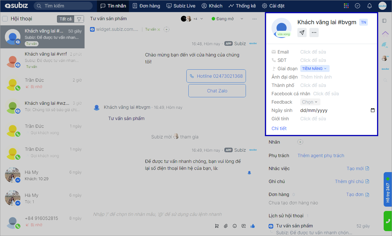 Trên Subiz, khi bạn mở bất cứ hội thoại hay một khách hàng, bạn đều xem được hồ sơ khách hàng ở cột bên phải màn hình.