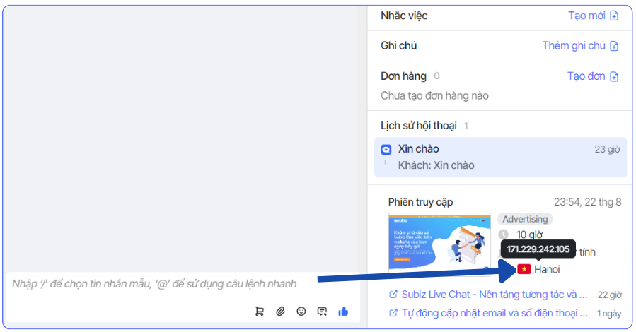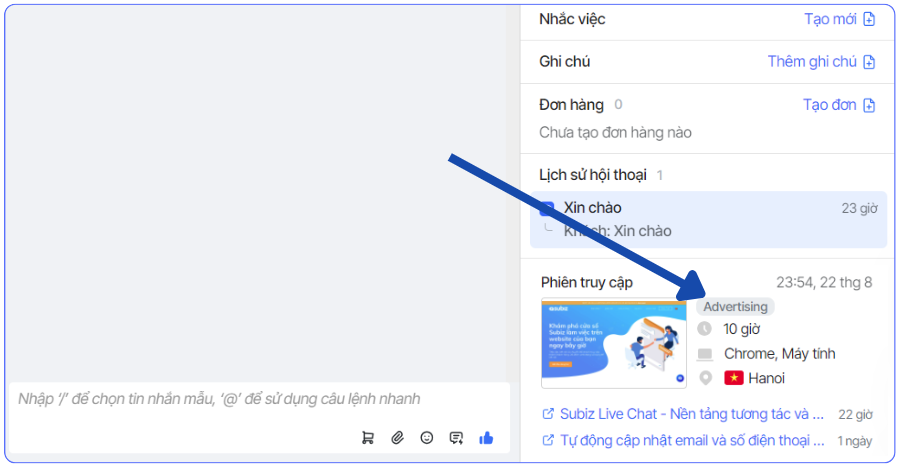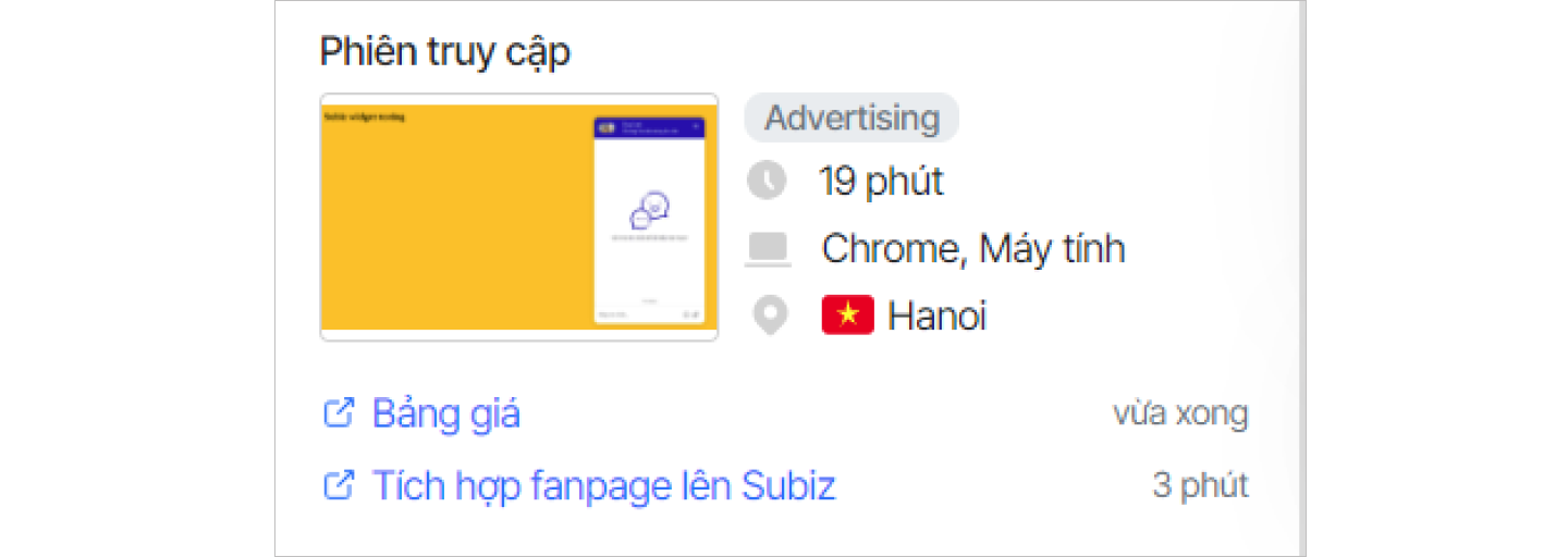 Ví dụ: xem lịch sử phiên truy cập website của khách, khách đến từ nguồn quảng cáo Advertising, địa chỉ Hà Nội, đã xem trang Tích hợp Fanpage lên Subiz và bảng giá,...
