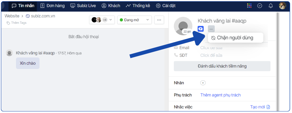 Trả lời: Bạn có 2 cách để chặn khách nhắn tin spam trên Subiz như sau: