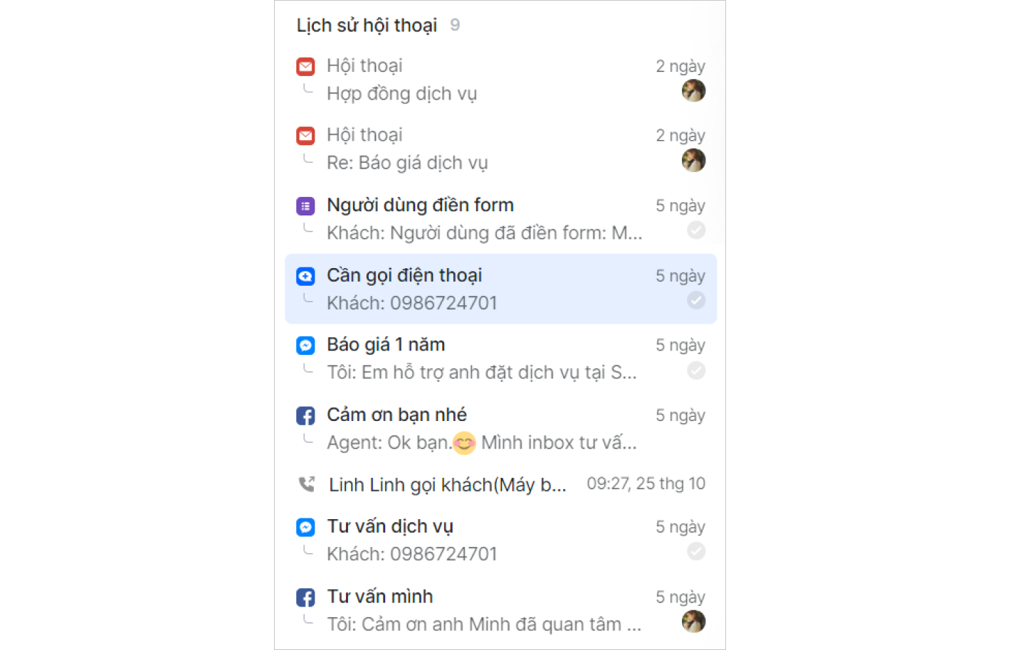 Ví dụ xem lịch sử hội thoại liên hệ của khách đã gửi email, nhắn tin website, bình luận Fanpage, inbox messenger,...