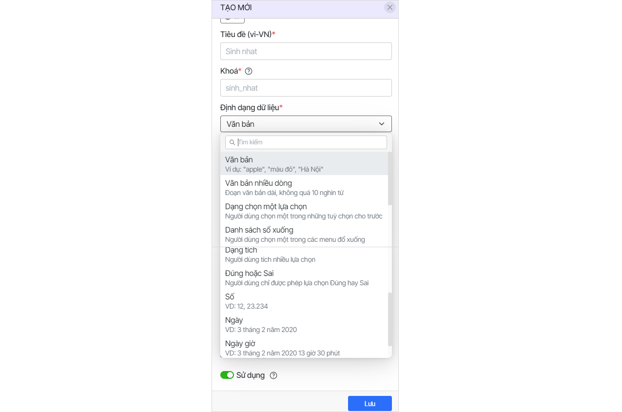 Ví dụ: Tạo thêm trường thông tin theo nhu cầu thuê căn hộ của khách. Chọn định dạng dữ liệu là dạng tích cho phép chọn nhiều căn hộ yêu thích của khách.