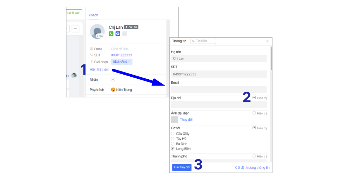 Chú thích: Khi bạn cần thay đổi thứ tự trường thông tin trong hồ sơ khách, bạn sẽ làm lại lần lượt các bước tích chọn hiển thị trường thông tin.