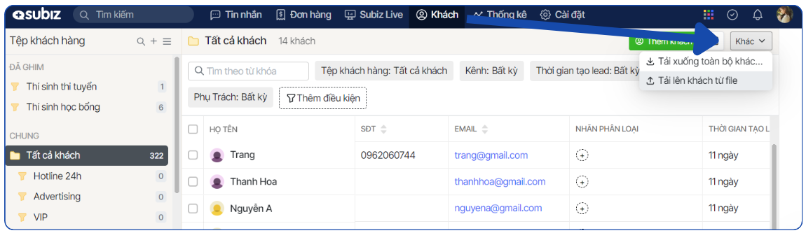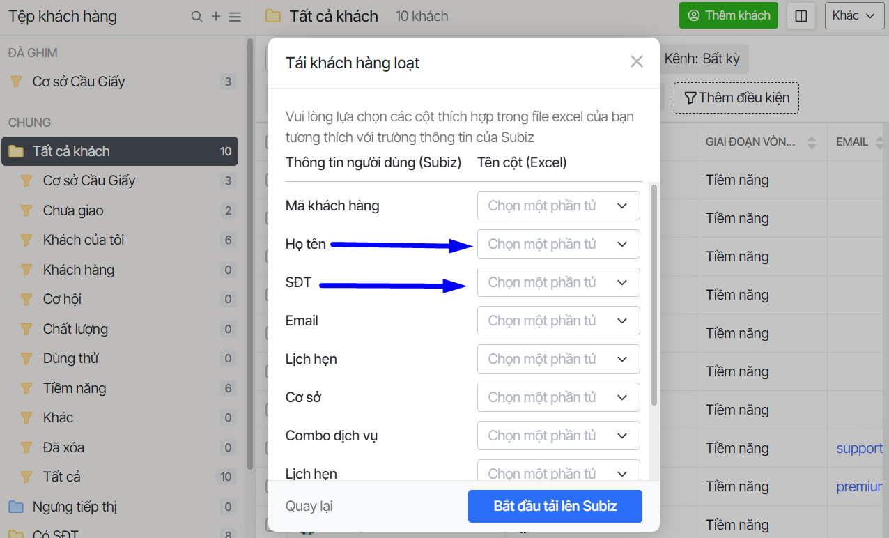 - Bạn cần nối ghép đúng các cột thông tin khách trên file excel với các trường thông tin khách đang có trên Subiz. Xem cách thêm trường thông tin mới trên Subiz.