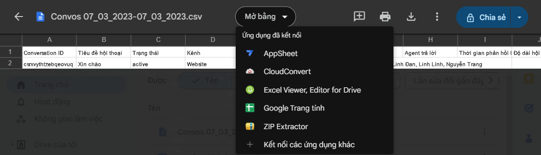 - Cách 1: Tải file khách lên Google drive, sau đó chọn mở bằng Google Trang tính (Google sheet)