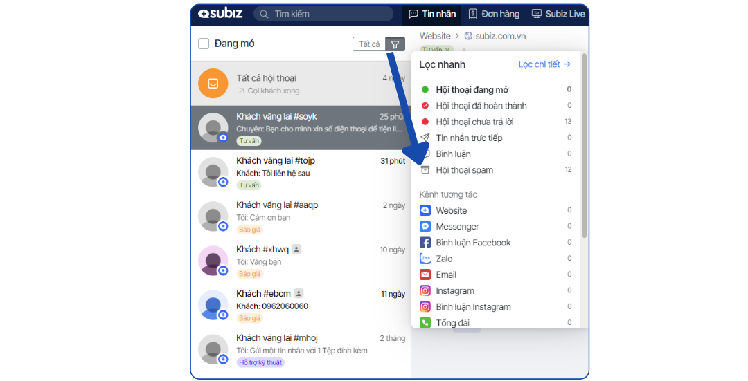 Trả lời: Bạn tìm lại hội thoại do chặn khách bằng cách chọn “NÚT LỌC” ở cột Hội thoại tại trang TIN NHẮN > chọn “Hội thoại spam”