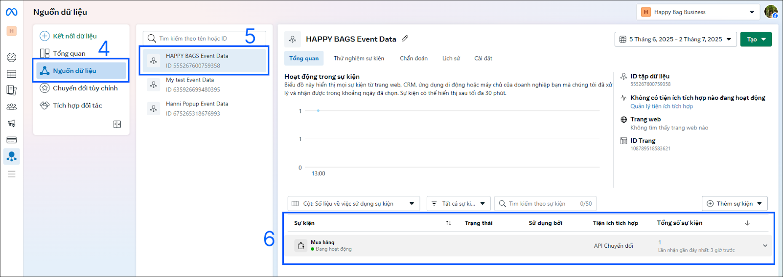 - Ở góc trái màn hình, chọn ‘nguồn dữ liệu’, chọn xem dữ liệu của Fanpage bạn vừa ghi nhận trên Subiz, bạn sẽ thấy Meta đã ghi nhận chuyển đổi khách mua hàng