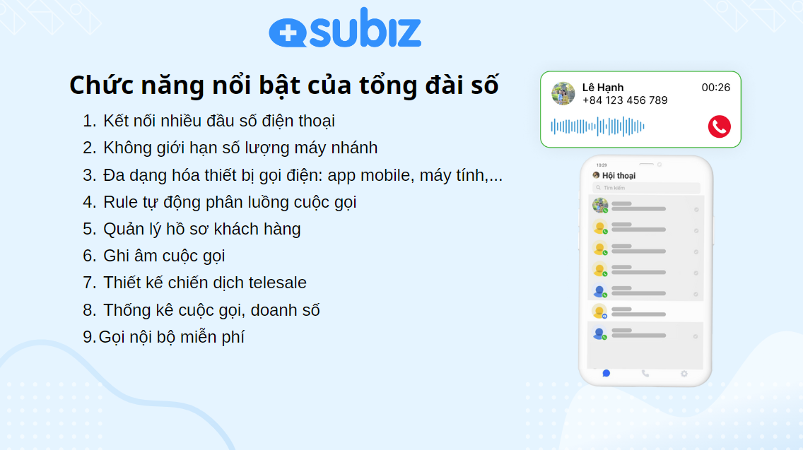 Một số chức năng nổi bật của tổng đài Subiz như sau: