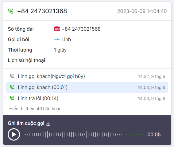- Theo dõi số cuộc gọi nhỡ và khách hàng gọi đến