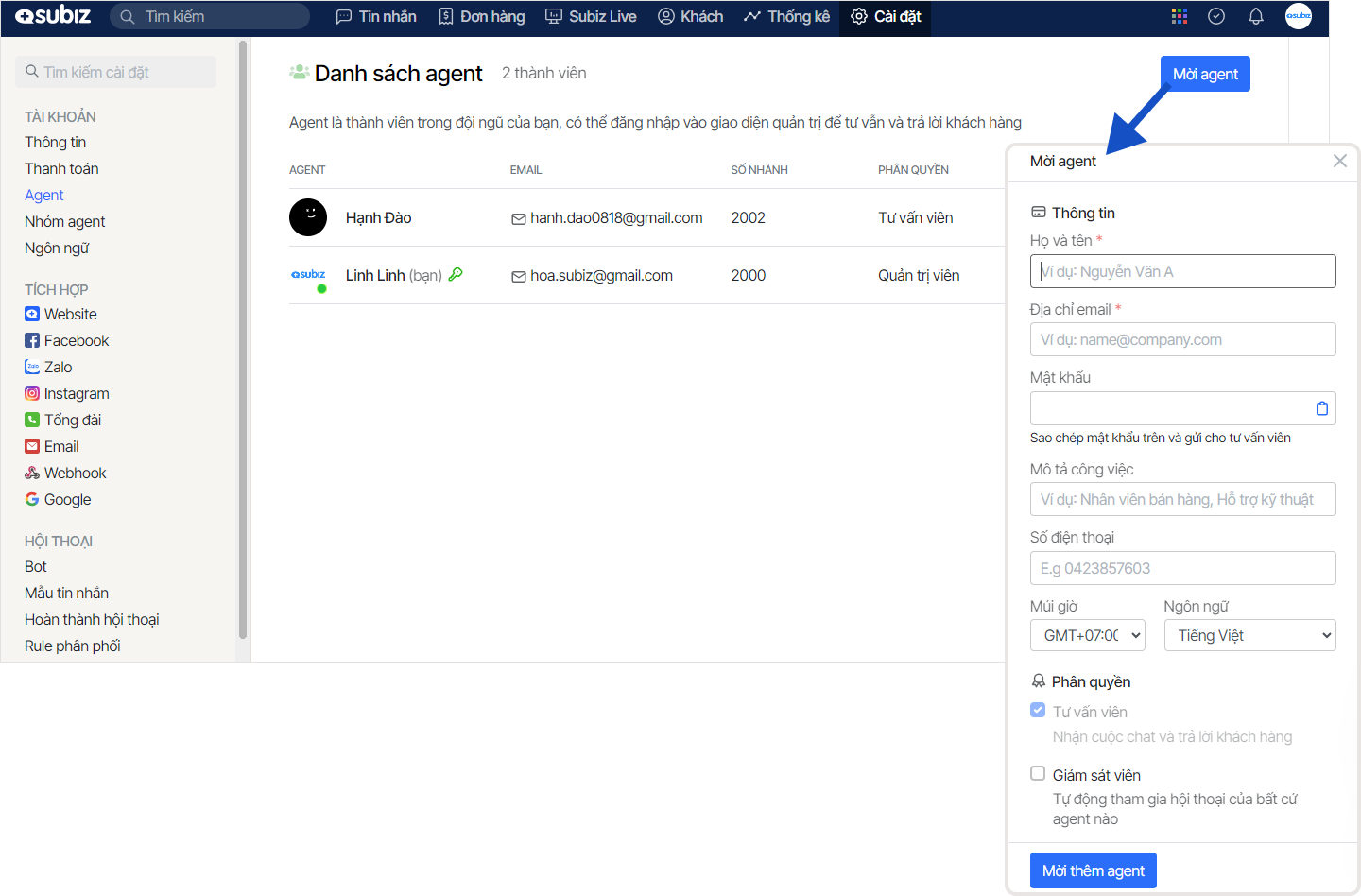 Mỗi máy nhánh trong tổng đài tương ứng với 1 agent trên Subiz. Agent là người làm việc trên Subiz, có email và mật khẩu đăng nhập Subiz riêng.