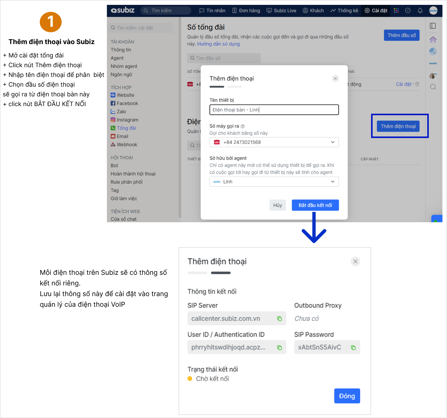 Chú thích: Khi bạn cần dùng softphone khác, bạn cũng sẽ thao tác thêm điện thoại trên Subiz và cài đặt các thông số liên kết.