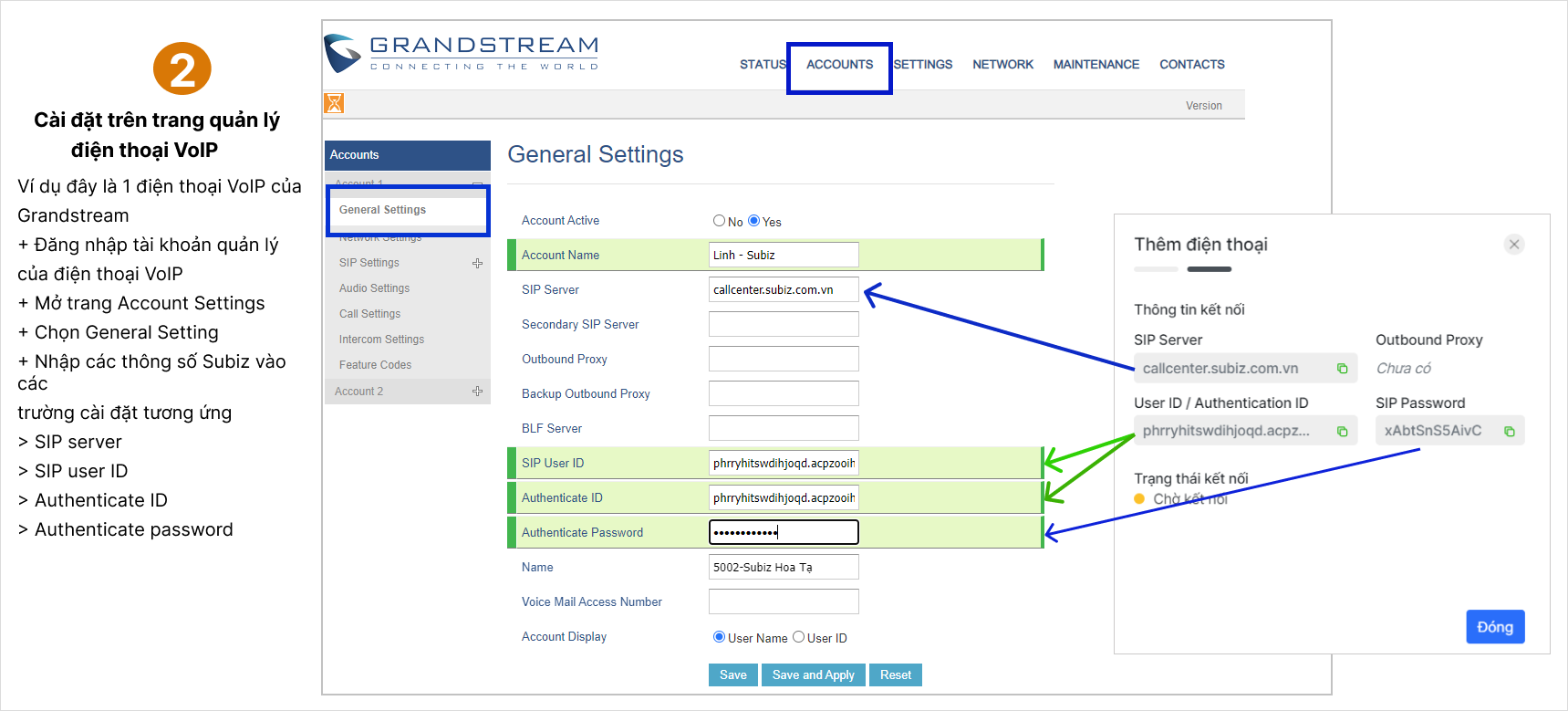 - Bước 3: Cài đặt trên trang quản lý điện thoại voip và nhập các thông số tổng đài Subiz.