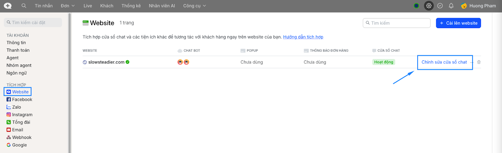 - Chọn Chỉnh sửa cửa sổ chat tương ứng với mỗi website