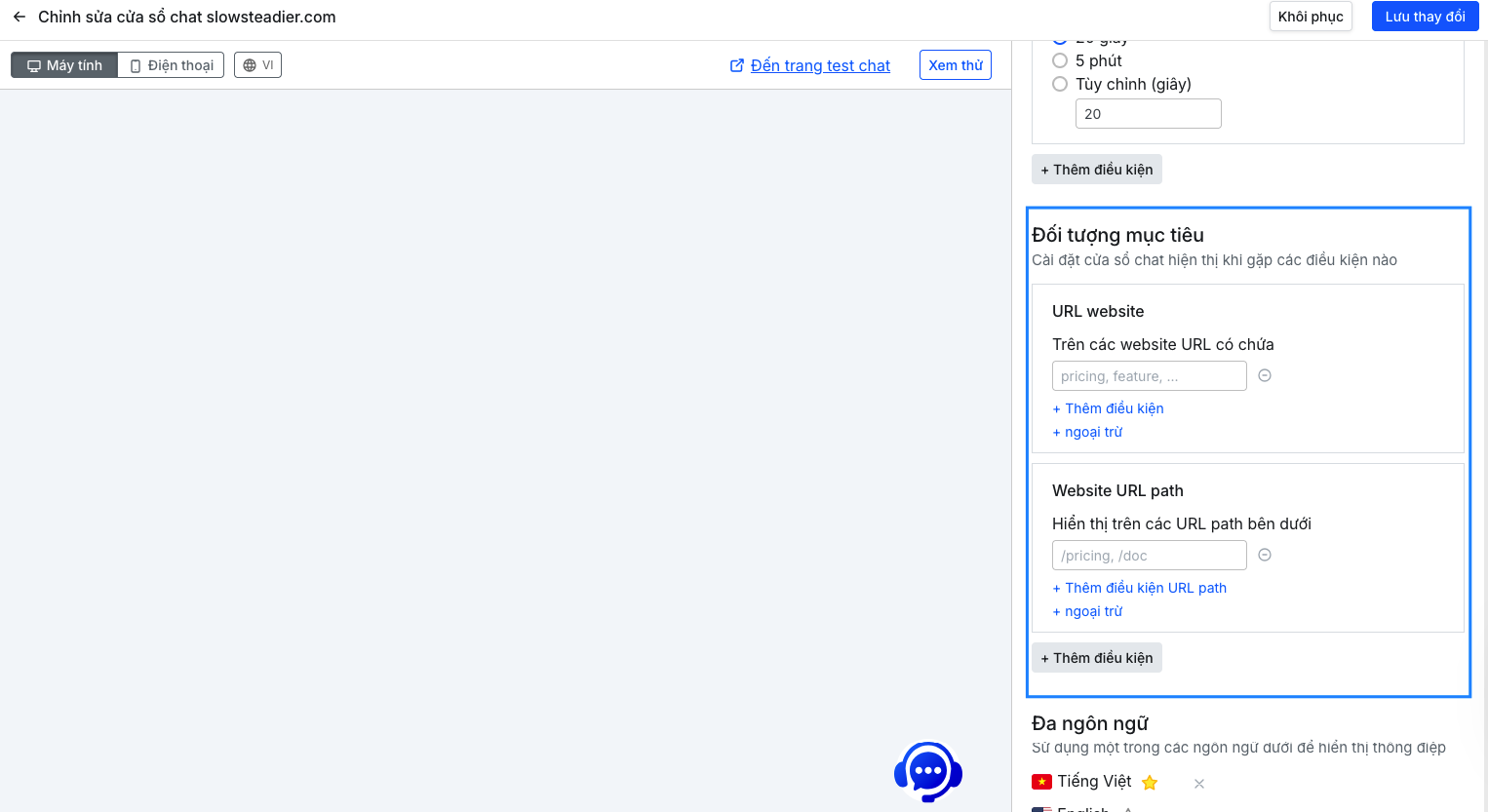 - Chọn Đối tượng mục tiêu nếu bạn muốn đặt cửa sổ chat chỉ hiển thị trên những trang con cụ thể trên website