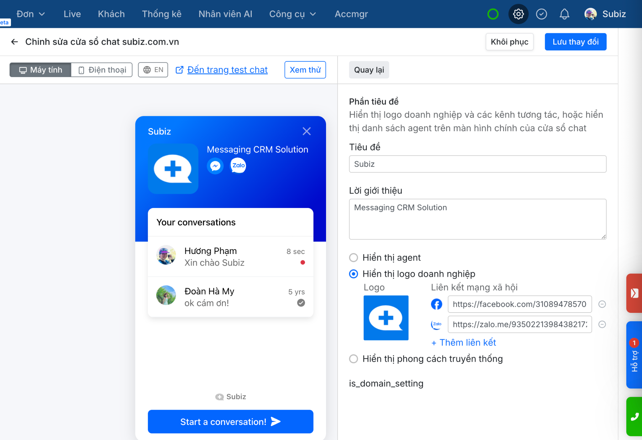Cách hiển thị tên và ảnh logo Doanh nghiệp trên cửa sổ chat