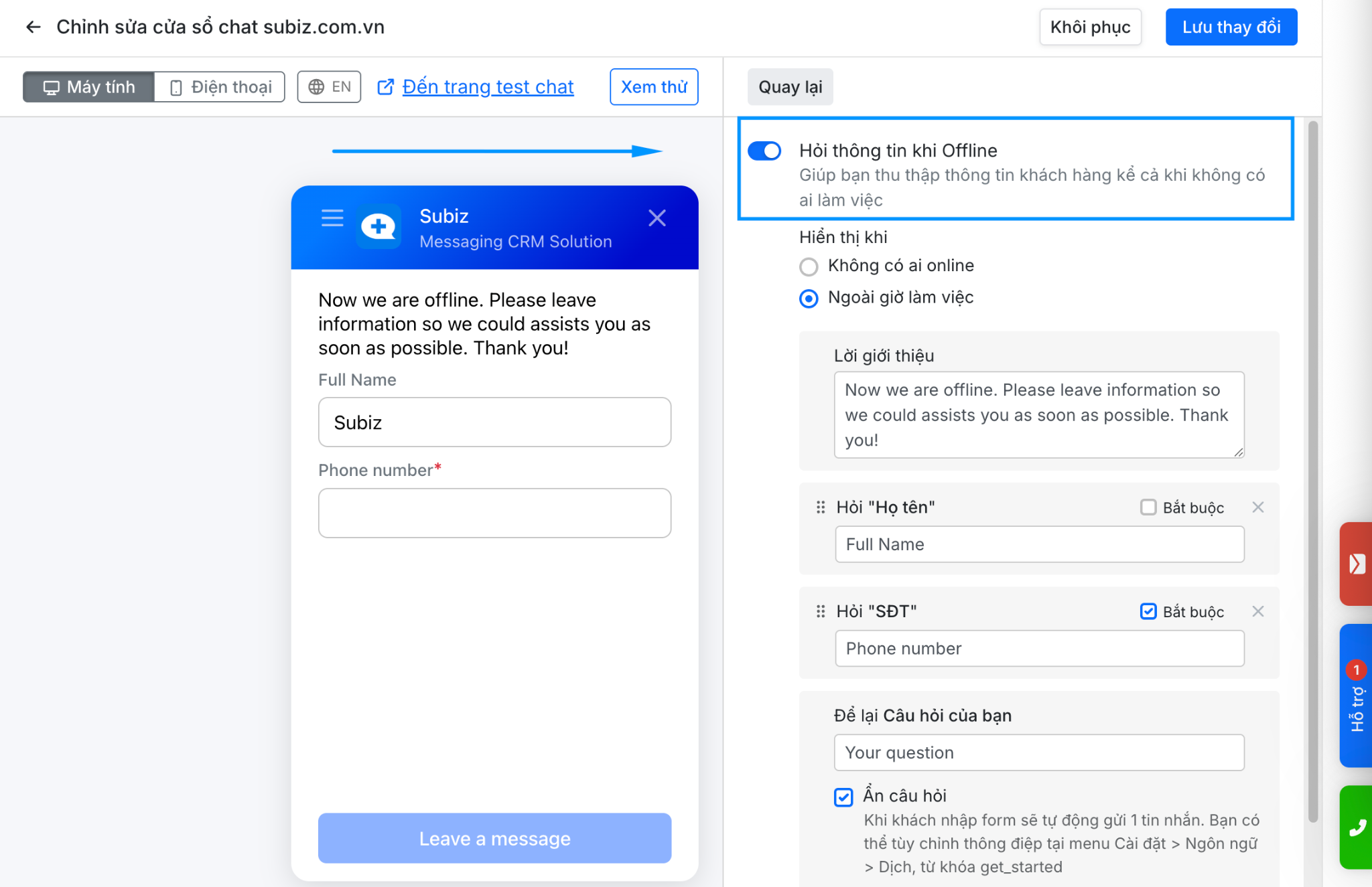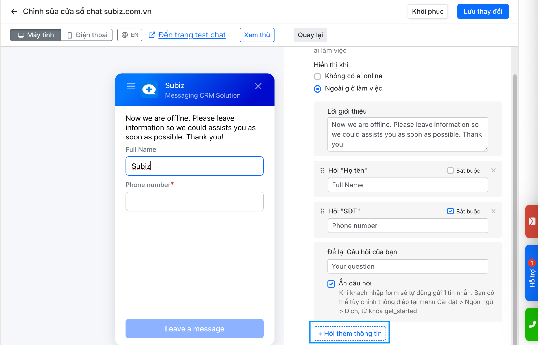 - Subiz mặc định chọn hỏi Họ tên, Số điện thoại và Thông điệp khách muốn để lại