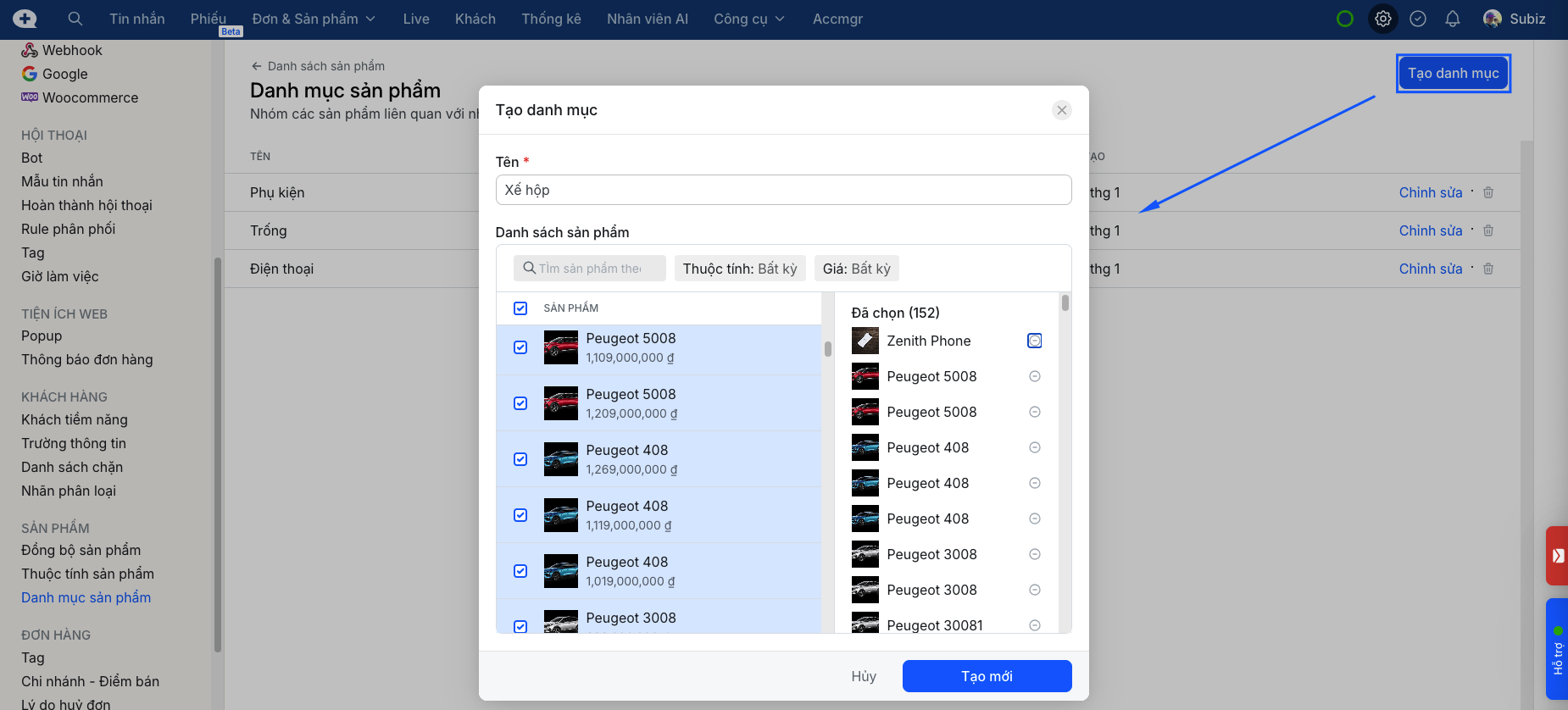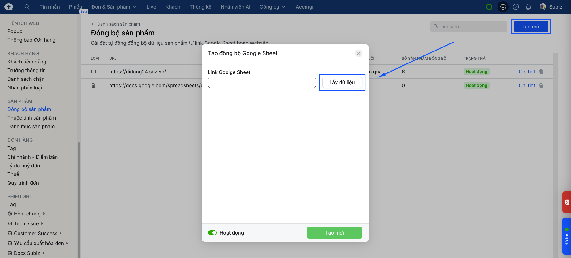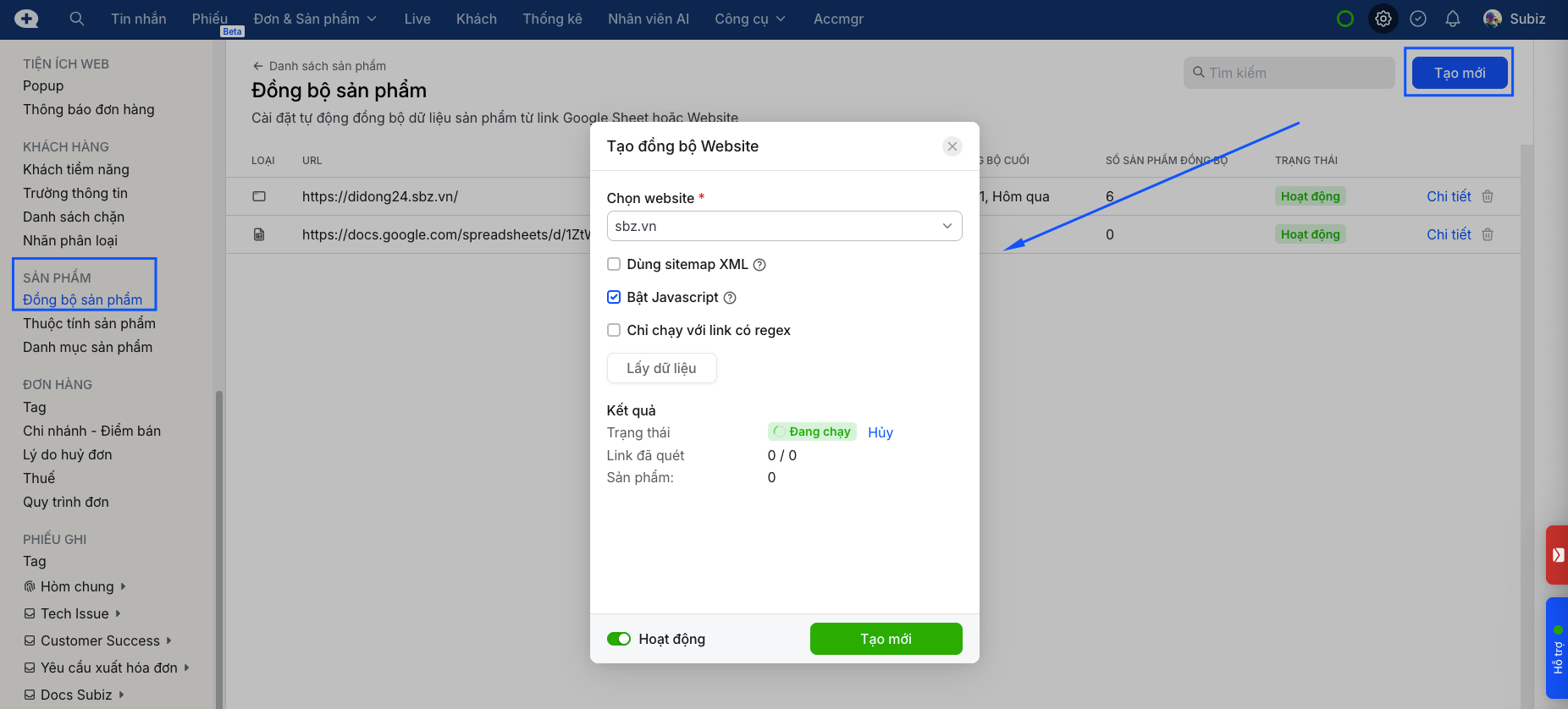 Đợi cho hệ thống quét & bấm Tạo mới để lưu danh sách sản phẩm về Subiz.