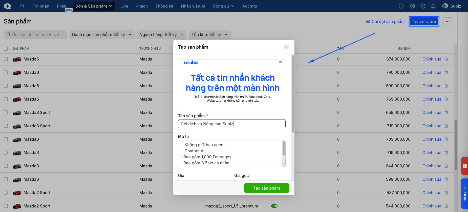Sản phẩm trên Subiz là một tính năng hỗ trợ nâng cao hiệu suất tư vấn bán hàng - tăng khả năng chốt đơn nhanh chóng. Sau khi đã có danh sách sản phẩm, bạn hoàn toàn có thể:
