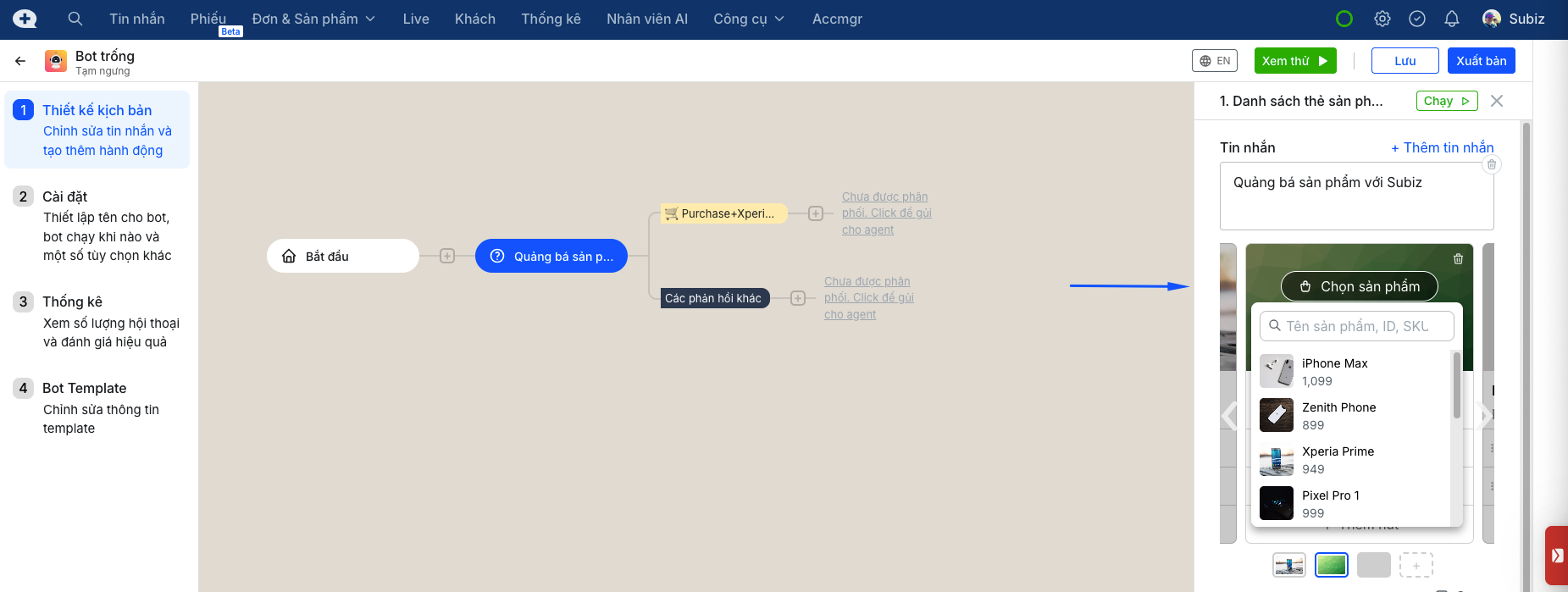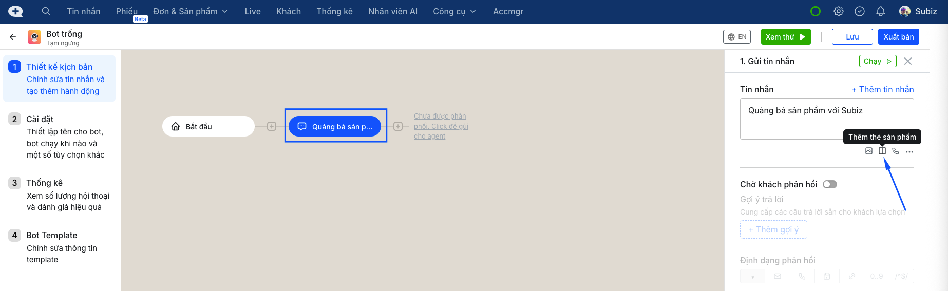 - Thiết kế kịch bản với tin nhắn chào khách và chọn Thêm thẻ sản phẩm