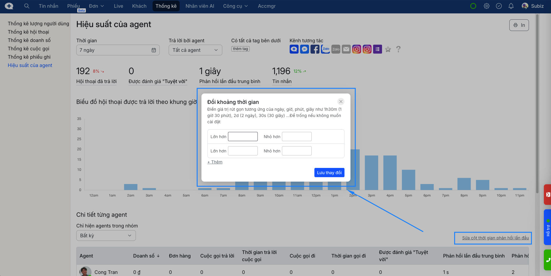 Lưu ý: Thời gian phản hồi trung bình được tính trong khung giờ làm việc. Ngoài giờ làm việc, với các hội thoại chatbot mời agent vào sau khi hoàn thành việc tự động phản hồi sẽ không tính vào thống kê này.
