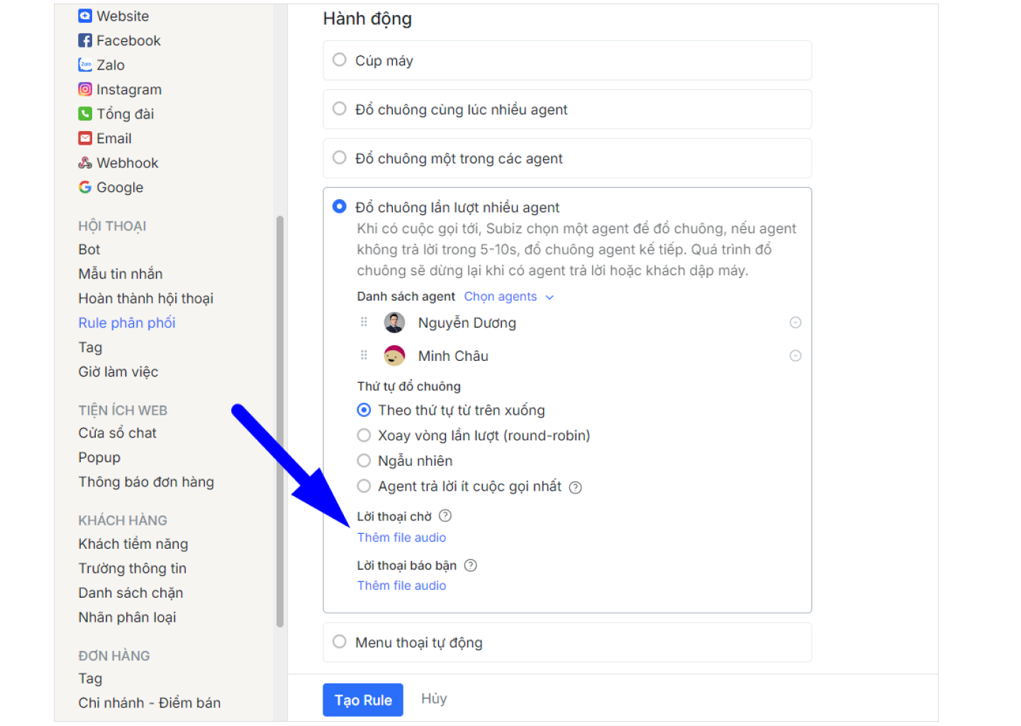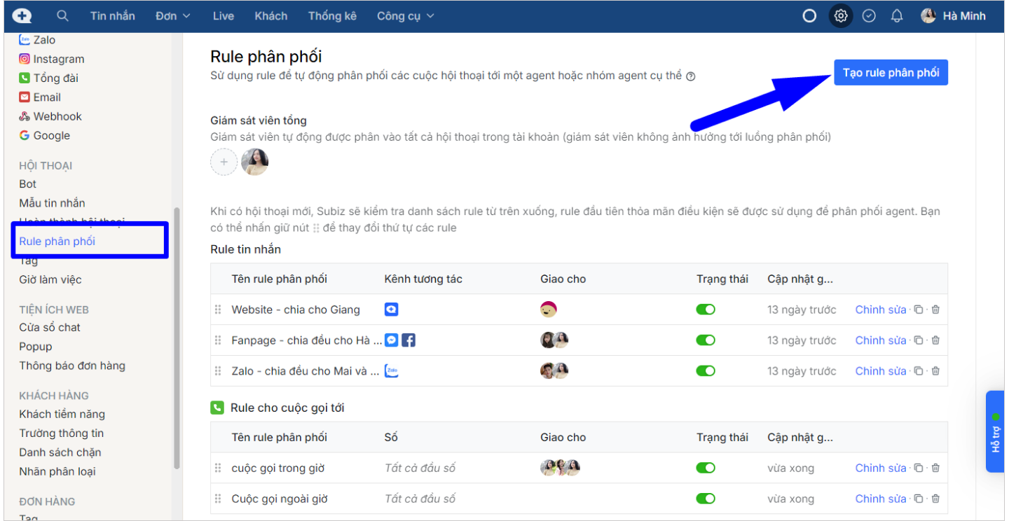 Bước 1: Mở trang cài đặt trên Subiz.- Chọn Rule phân phối